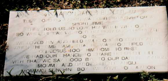1995 They told us Aaron was ours for a short time. They told us to love him while we could. So while he lay we told how much he meant to us. We loved him and held him close to our hearts. When the time came that he was too tired to go on, Jesus took him home to rest. We had our chance to share his little life. With that we say goodbye to our darling Aaron. Mommy and Daddy's Little Angel Momma's Sunshine Boy We love you Aaron. |