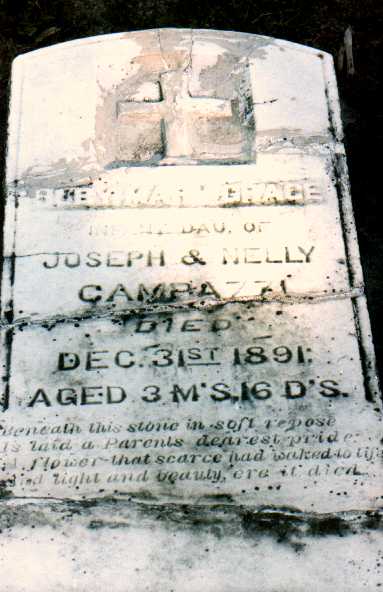 Mary Grace Infant Dau. of Joseph & Nelly Campazzi Died Dec. 31st, 1891 Aged 3 M's, 16 D's Beneath this stone in soft repose Is laid a Parent's dearest pride: A flower that scarce had waked to life And life and beauty, ere it died |