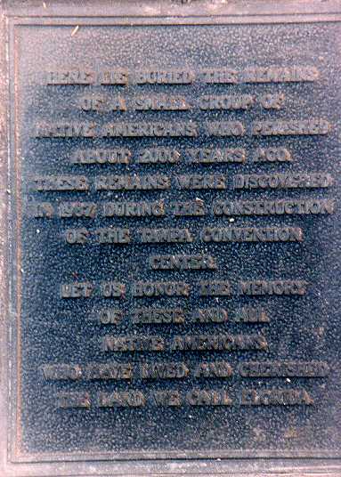 lie buried the remains of a small group of Native Americans who perished about 2000 years ago. These remains were discovered in 1987 during the construction of the Tampa Convention Center Let us honor the memory of these and all Native Americans who have lived and cherished the land we call Florida. |